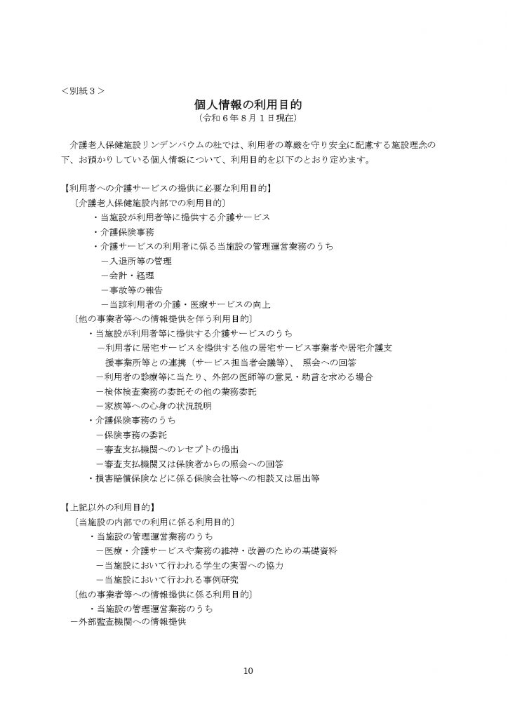 リンデンバウムの杜(入所・短期) 個人情報の利用目的